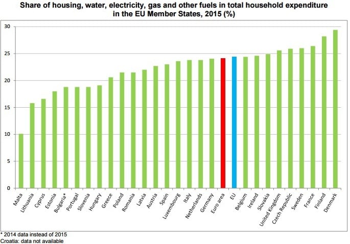 Заметим, что в 2015 четверть общих расходов домохозяйств в Европейском Союзе уплачивались за жилье, воду, электроэнергию, газ и другие виды топлива.
