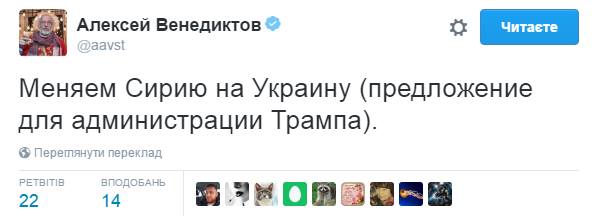 Российский журналист Александр Тверской отреагировал на твит главреда «Эхо Москвы» Алексея Венедиктова, в котором тот предложил администрации Трампа поменять Сирию на Украину.