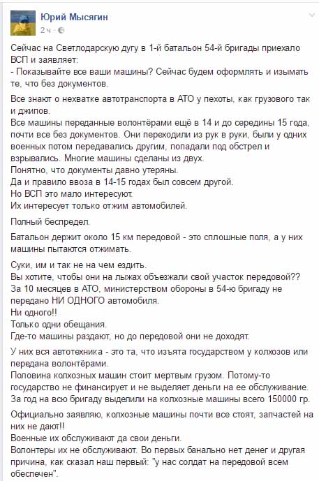 Сегодня, 6-го декабря, в район Светлодарской дуги к позициям 1-го батальона 54-й бригады приехали представители военной службы правопорядка для изъятия транспорта, предоставленного волонтерами.