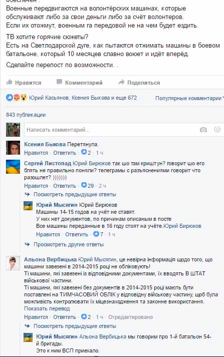 “Вы хотите, чтобы они на лыжах объезжали свой участок передовой?? За 10 месяцев в АТО Министерством обороны в 54-ю бригаду не передано НИ ОДНОГО автомобиля”, - заявил активист.