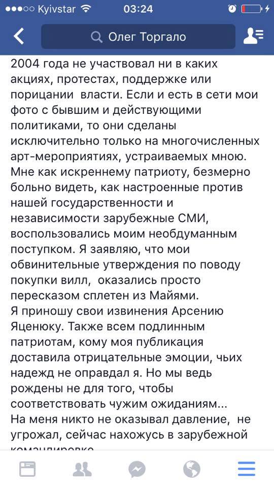 Автор информации о якобы покупке экс-премьером Арсением Яценюком 24 вилл в США Олег Торгало извинился за данную публикацию, а также сообщил, что не имеет никаких подтверждений своего заявления, которое "по сути является пересказом сплетен из Майями".