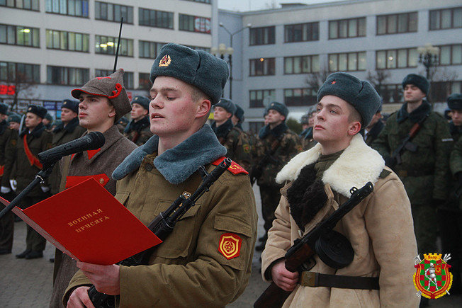 «Могу заверить, что присяга на верность белорусскому народу была принята в соответствии с законодательством Республики Беларусь, клялись по-белорусски и по-русски, — говорит Макаров. — А перед гостями и новым пополнением была показана реконструкция ритуала военной присяги солдатами разных периодов XX века. Реконструкция была именно для гостей праздника, было подчеркнуто, что наши отцы и деды шли в бой с фашистскими захватчиками в годы Второй мировой войны».