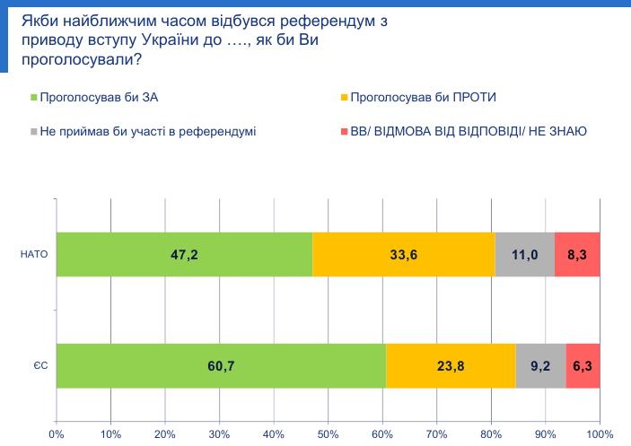 Таким образом, в референдуме приняли бы участие 84,5% граждан Украины, а их голоса распределились бы следующие образом: 71,8% - за, 28,2% - против, отмечает Зеркало недели.