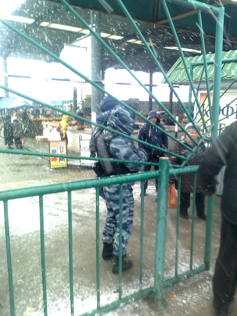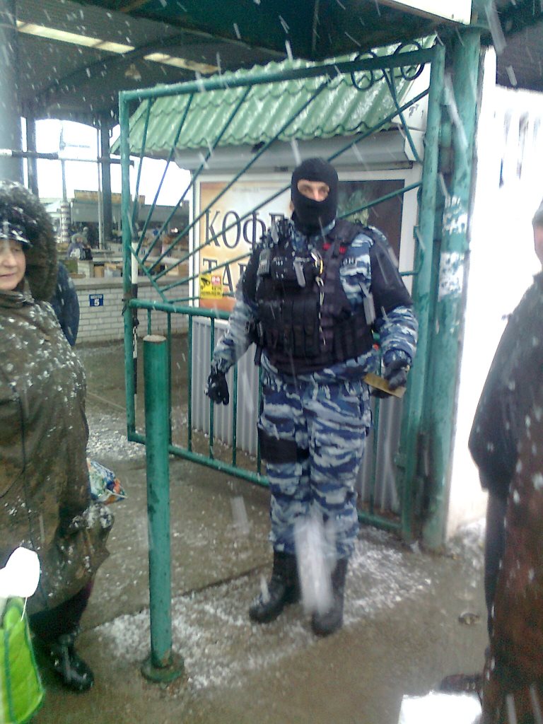 Очевидец Олег Гачков рассказал в комментарии Центру информации по правам человека, что ворота рынка были перекрыты двумя "правоохранителями" в сине-пятнистом камуфляже с надписями "ОМОН".