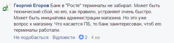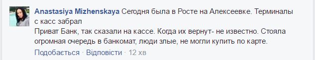 Как сообщают пользователи соцсетей, не только в "Росте" на Холодной Горе покупателям сообщают о том, что ПриватБанк забрал терминалы: