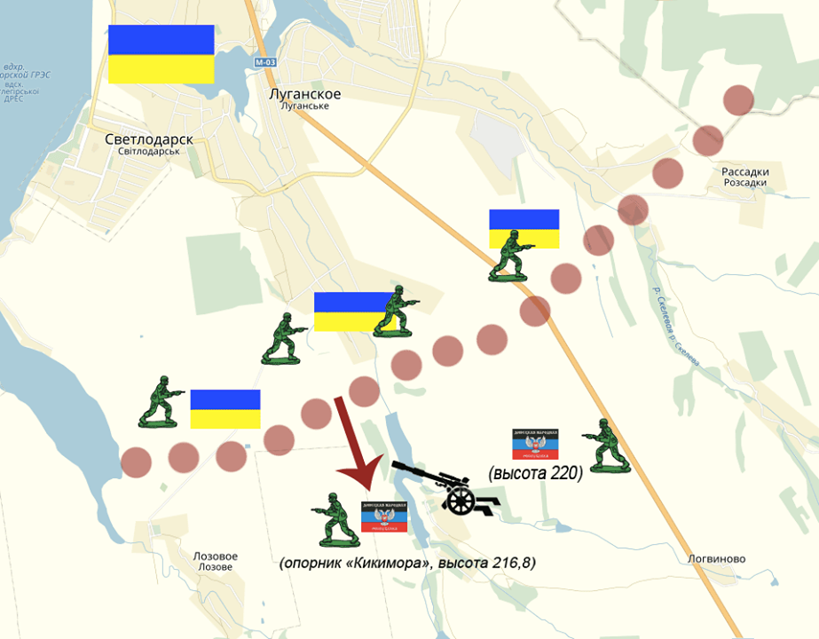 В то же время, с учетом того, что данный район находится на стыке между т.н. ЛНР и ДНР, оборона противника на данном участке была явно ослаблена из-за проблемы во взаимодействии между силовыми структурами обоих террористических организаций. Не удивительно, что командование наших войск стремилось этим воспользоваться для улучшения позиций как в тактическом плане, так и в стратегическом.