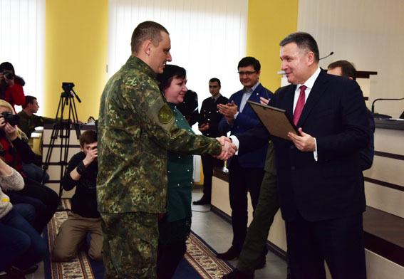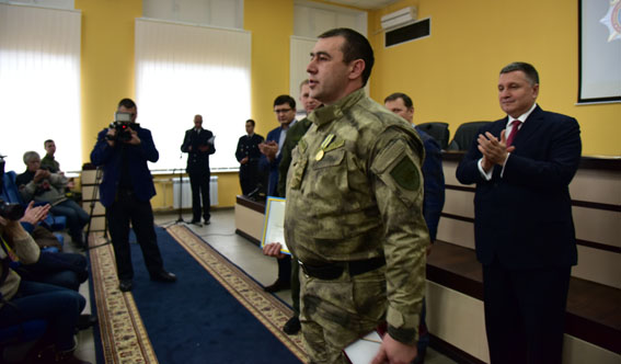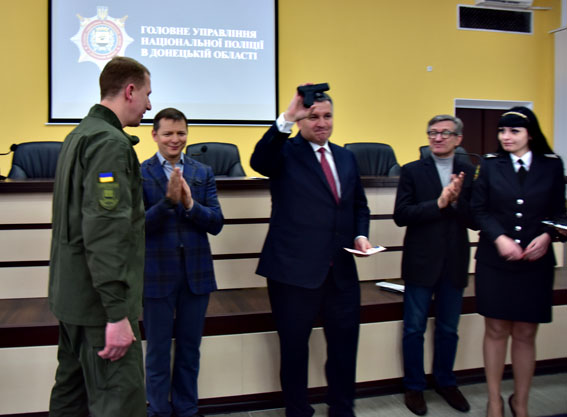 Арсен Аваков вручил знак отличия МВД «Огнестрельное оружие» инициатору этих проектов, начальнику полиции Донецкой области Вячеславу Аброськину и еще трем руководителям подразделений полиции прифронтового региона.