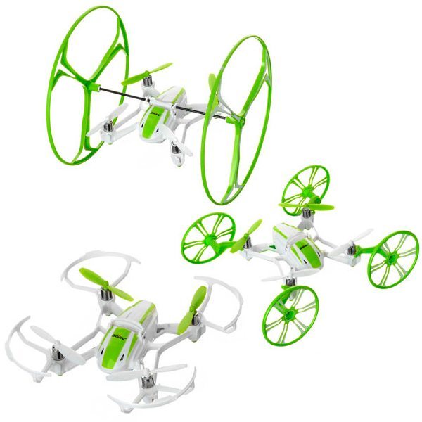 Модель U843 может заворожить ребенка любого возраста. Это не просто радиоуправляемый летательный аппарат, а трансформер 3-в-1. В «режиме полета» он представляет собой маленький, легкий комнатный коптер длиной 125 мм. Он выглядит изящно: бело-зеленая расцветка, корпус, похожий на игрушечный автомобильчик, тонкие двойные лучи рамы.