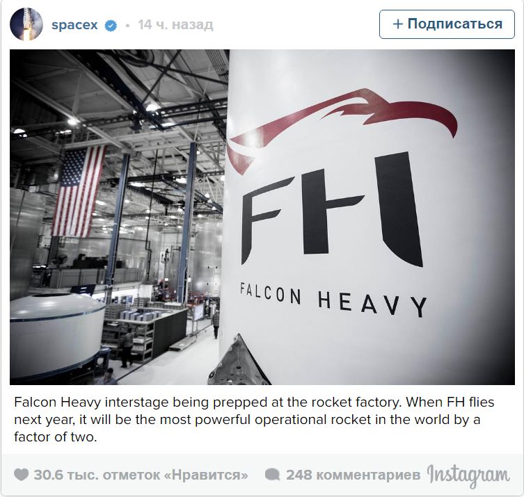 Компания SpaceX опубликовала в Instagram первый снимок создаваемого ею сверхтяжелого носителя Falcon Heavy. Его грузоподъемность составляет 54,4 тонны на низкой опорной орбите, что почти в два раза превышает возможности по выводу полезной нагрузки у самой мощной эксплуатируемой на текущий момент в мире ракеты Delta IV Heavy, сообщает Лента.ру