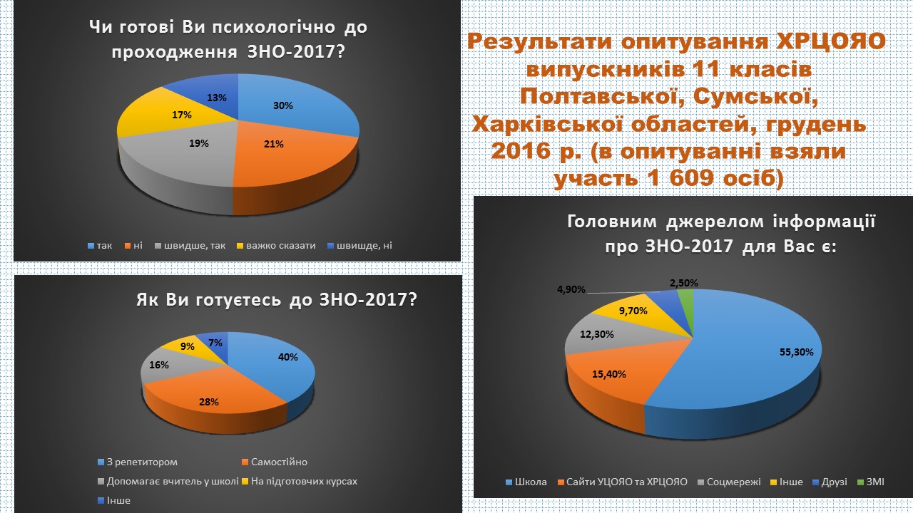 Как отметили в центре, 29,8% опрошенных отметили, что психологически готовы к прохождению ВНО, 55,3% - указали школу, как главный источник информации о внешнем оценивании, 28% готовятся к ВНО самостоятельно.