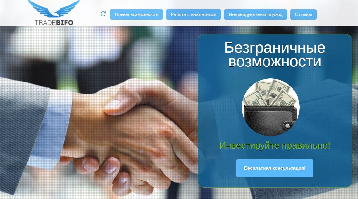 Можно сказать, что Tradebifo - это элитный финансовый клуб, который помогает начать хорошо зарабатывать или приумножить состояние. При этом все честно и прозрачно. Нужно лишь свободное время, холодная голова и умение анализировать.