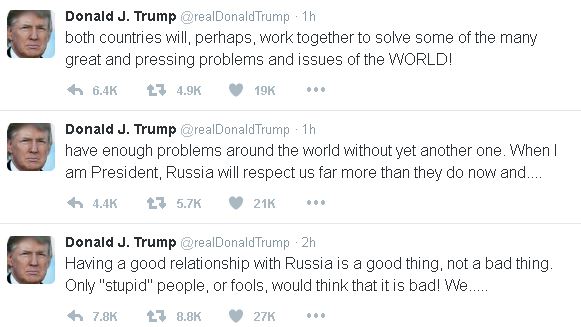 "У нас и без того есть достаточно проблем в мире. При мне как президенте Россия будет уважать нас гораздо больше, чем сейчас, - продолжил он. - И обе страны, возможно, будут работать вместе для решения некоторых из многих больших и неотложных мировых проблем и вопросов".