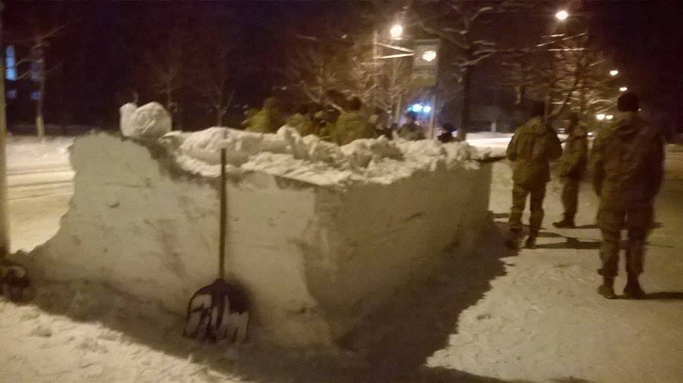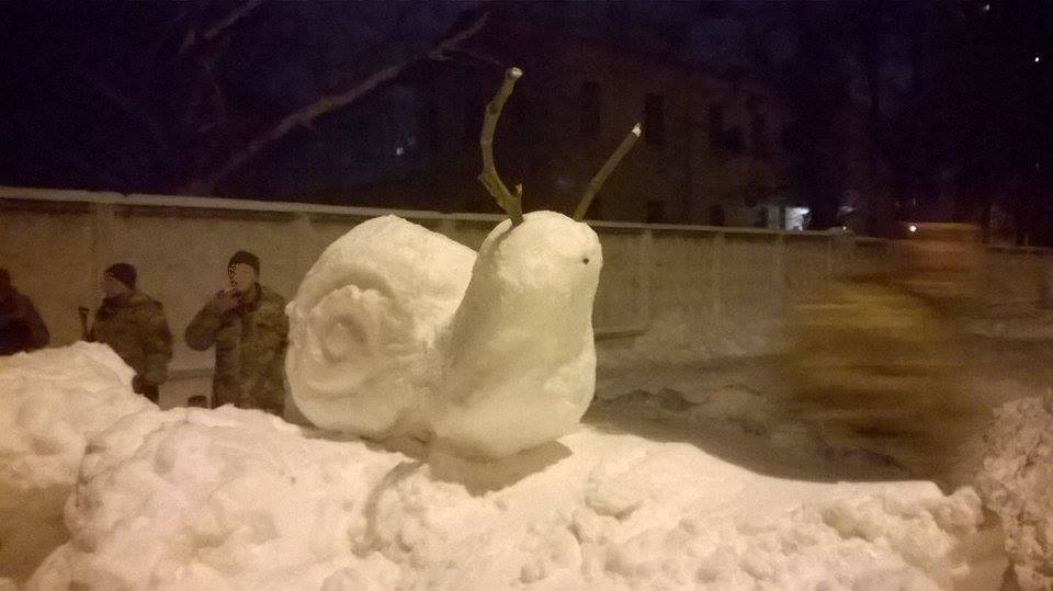 Вони роблять зупинку зі снігу. Автобусну. Чому вони її роблять? Бо бухий (ОНОВЛЕННЯ: можливо, при цьому він був навіть тверезий, детальніше нижче) капітан зателефонував і поставив бойове завдання курсантам зробити ЗУПИНКУ ЗІ СНІГУ. Я не жартую. Коли запитали, навіщо, капітан відповів, що така його примха. Курсантів у свій вихідний, в мороз, після кількагодинного прибирання снігу вивели за територію частини і наказали робити зупинку зі снігу. А потім додати з боків по протитанковій башті. Зі снігу. Курсанти зробили їх у вигляді равликів на честь прізвища «креативного» капітана УЛІТКО.Чому вони не відмовились? Відмова = невиконання наказу старшого за званням і тягне за собою догани зі зняттям %зп та різноманітні утиски загалом. Чи були б вони? Цілком можливо. Між відмовитись і мати проблеми та виконати і мати зафіксований прецедент - обрали друге. Відзняли фото та відео, показали комбату. Чи буде результат? Хз.