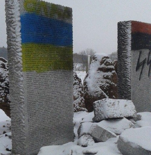 Он также уточнил, что вертикальные плиты, которые стояли на месте уничтоженного села, разрисовали в сине-желтые и красно-черные цвета, оставили надписи. Горизонтальные плиты разбиты вдребезги. Памятник уничтожен на 50%.
