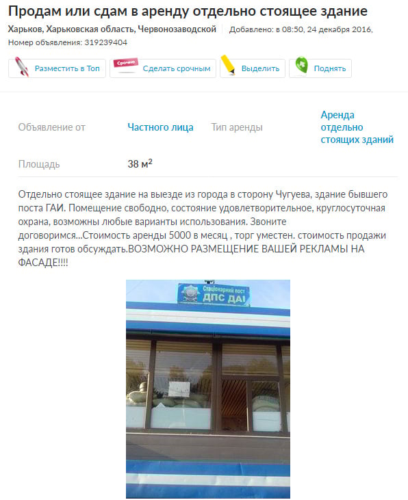 В сети предлагают продать и сдавать в аренду отдельно стоящее здание бывшего поста ГАИ, расположенное на выезде из Харькова в сторону Чугуева. 368.media связалась с автором объявления Станиславом.