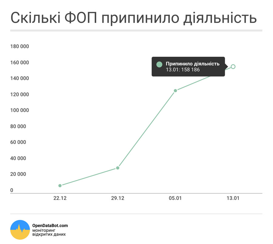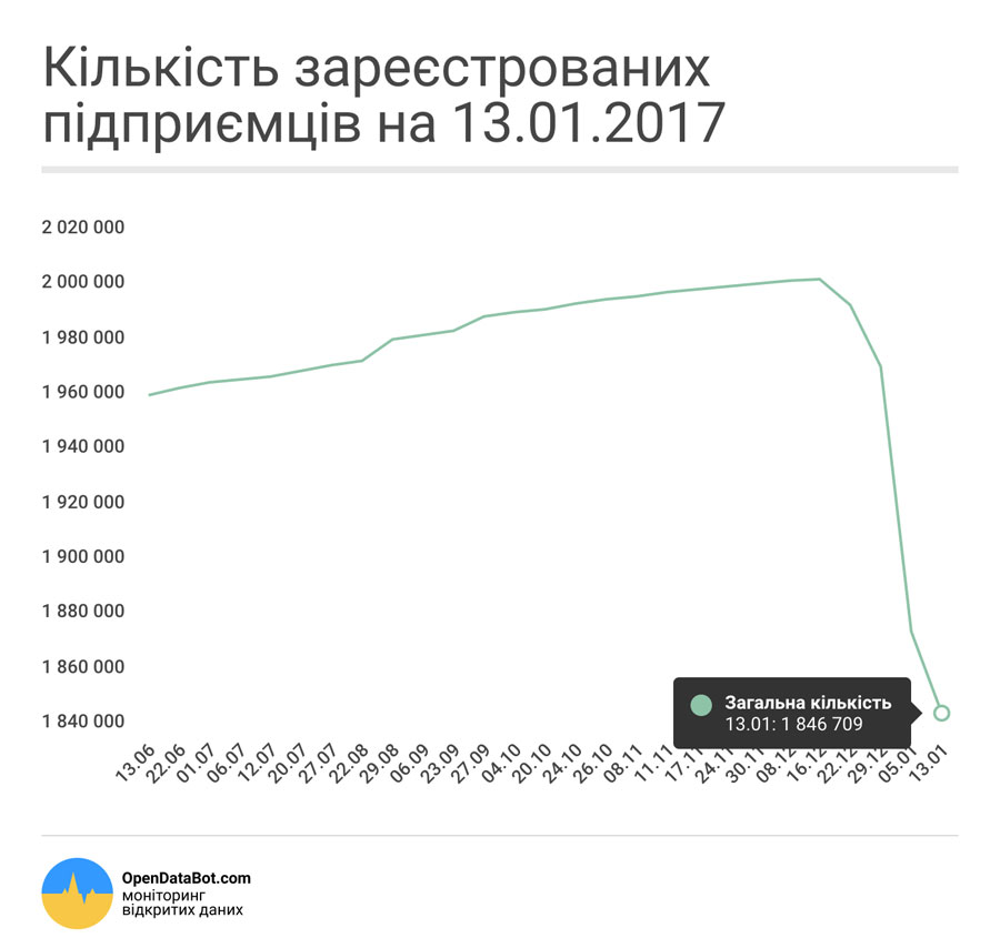 По данным сервиса, к 16 декабря количество физлиц-предпринимателей превышало 2 млн, но с тех пор начало сокращаться. «Мы в OpenDataBot мониторим реестр ФОП с 6 июня 2016. К 16 декабря 2016 количество ФЛП со статусом «зарегистрировано» достигло максимальной отметки — 2 004 895. После этого каждую неделю количество зарегистрированных ФЛП уменьшается. На 13 января осталось 1 846 709 таких ФОП, всего закрылось 158 000 на данный момент», — рассказывает разработчик сервиса, сооснователь 908 Алексей Иванкин.