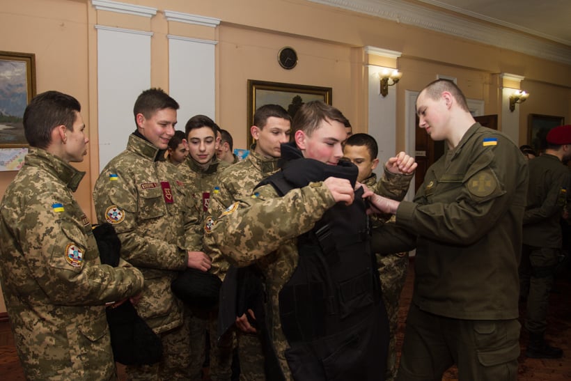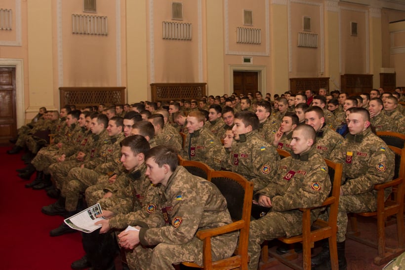 Старший лейтенант Богдан Патрик ознайомив майбутніх офіцерів із зразками зброї, що стоїть на озброєнні в Національній гвардії та зразками форми одягу. Серед представленого озброєння були і найсучасніші зразки, що виготовляються в Україні і вже використовуються у військах.
