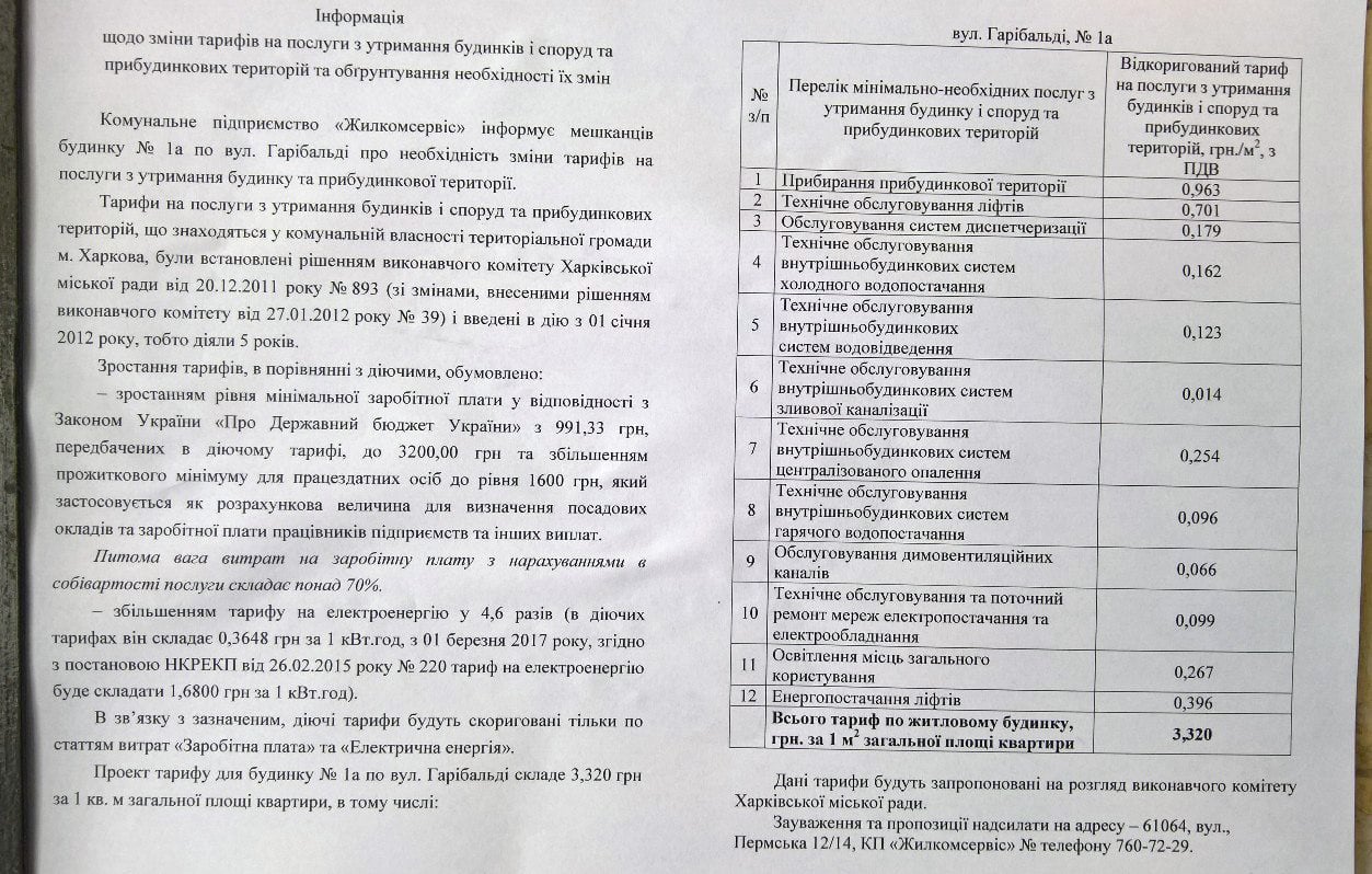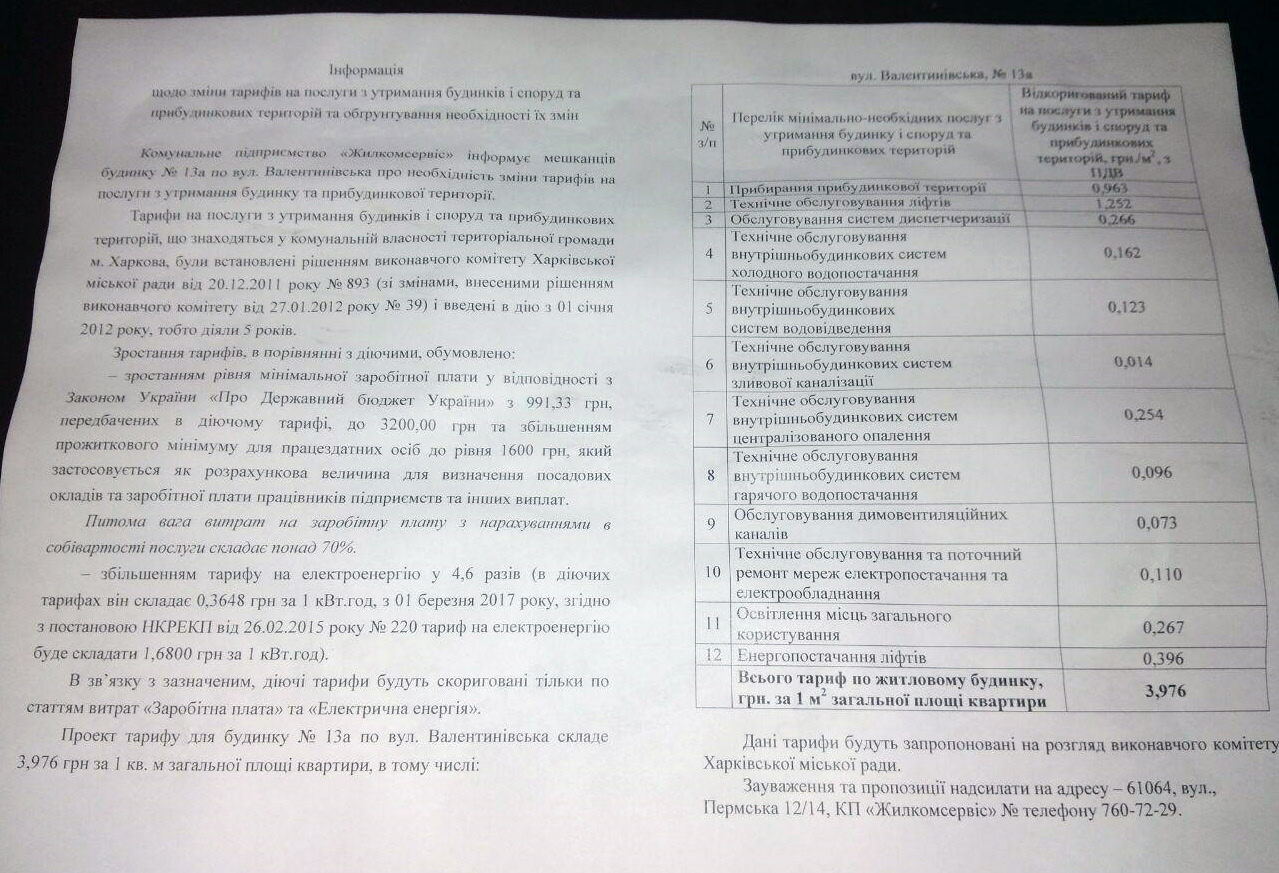 На подъездах харьковских многоэтажек, обслуживаемых коммунальным предприятием «Жилкомсервис», появились уведомления о вероятном изменении тарифов на услуги содержания домов, сооружений и придомовых территорий.