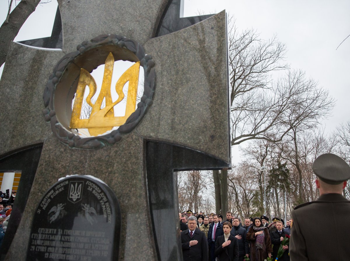 Президент Украины Петр Порошенко вместе с супругой Мариной, а также спикером Верховной Рады Андреем Парубием и членами Кабинета министров почтили память защитников украинской государственности, погибших в бою у села Круты (Киевская обл.) в 1918г в бою против превосходящих сил Красной гвардии, сообщает Главное со ссылкой на Интерфакс-Украина.