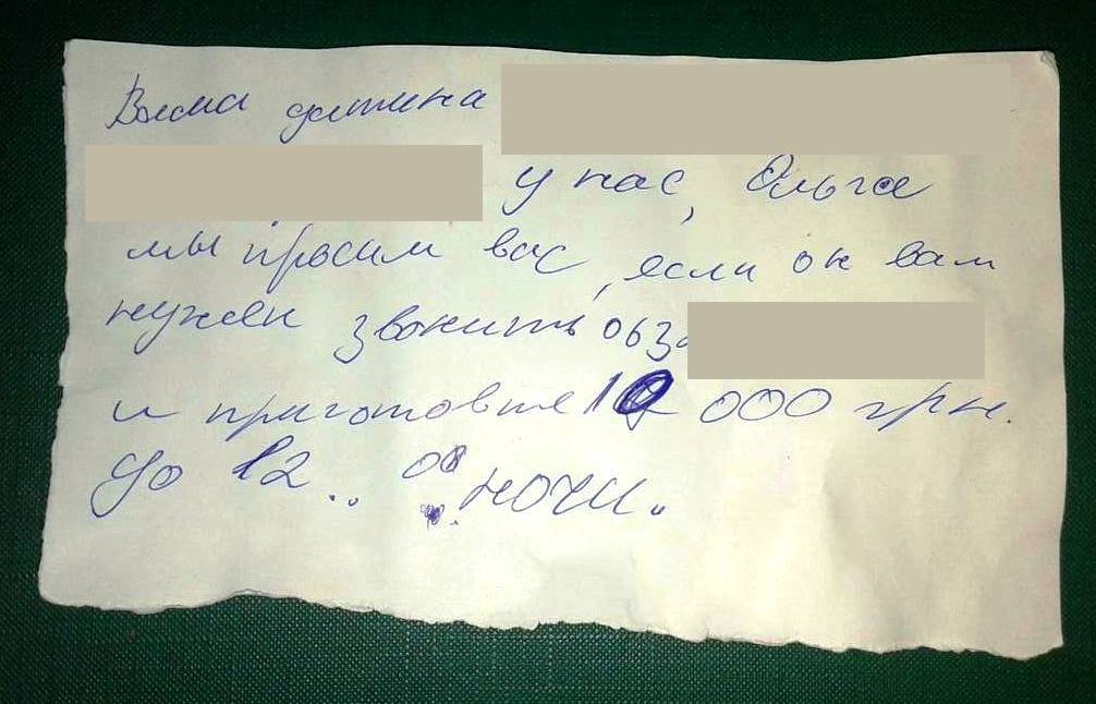 «Ваша дитина у нас…мы просим вас, если он вам нужен… приготовте 10000 грн до 12.00 ночи» (Орфография оригинала).