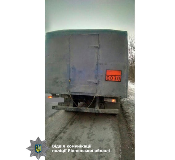 Учора, 30 січня, близько 17 години на автодорозі «Київ-Чоп» у селі Молодаво Дубенського району патрульні поліцейські зупинили вантажівку, обладнану попереджувальним знаком про перевезення небезпечного вантажу. Технічний стан автомобіля за зовнішніми ознаками викликав у правоохоронців підозру.