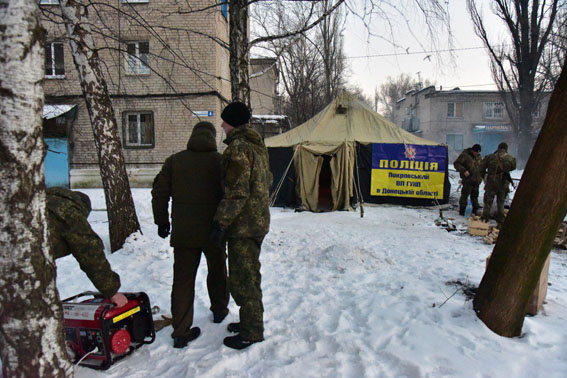 У Авдіївці, де ще три дні тому працював завод та діти ходили до школи, цілковита темрява, лютий холод, страшний гуркіт ворожих снарядів та гудіння генераторів. У таких умовах правоохоронці патрулюють місто вдень і вночі. Сили поліції в Авдіївці збільшено втроє. Правопорядок збережено, ситуація важка, але контрольована.