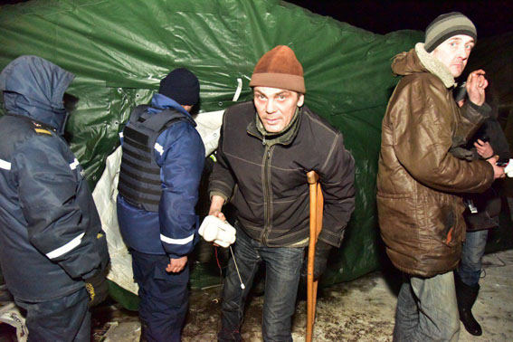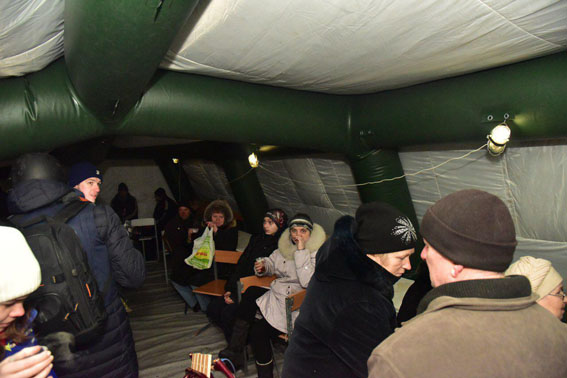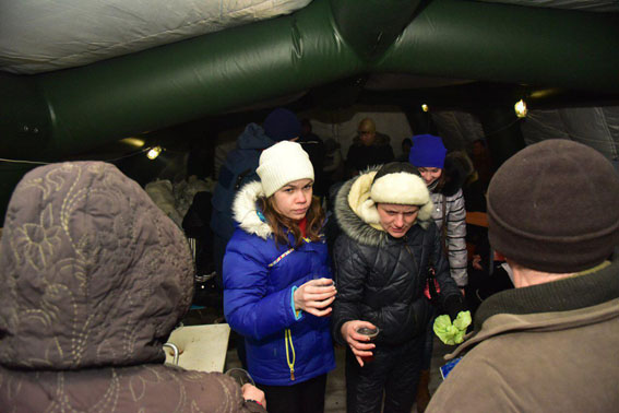 Поблизу, на місцевому стадіоні розташований гуманітарний штаб Держслужби з надзвичайних ситуацій. Люди тягнуться до наметів, де можна отримати гарячий суп і чай, отримати медичну допомогу. А ще тому, що тут – поліцейські і рятувальники, поряд з ними – спокійніше.