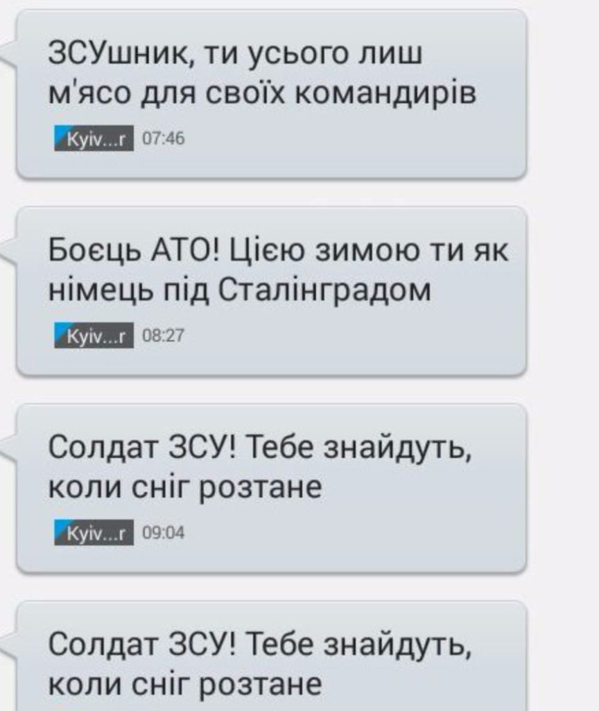 Так, с самого начала боевых действий украинским военнослужащим с неизвестных телефонных номеров тысячами приходят sms-сообщения с угрозами и оскорблениями. Многие военнослужащие фотографируют их и затем размещают в соцсетях. В сообщениях, написанных исключительно на украинском языке, говорится, что "украинские солдаты являются всего лишь мясом для своих командиров", что "они словно немцы под Сталинградом" и "их найдут только тогда, когда растает снег".