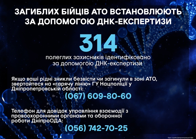 За час АТО до Дніпропетровщини доставили тіла 1407 бійців. З них 484 – мешканці Дніпропетровської області. Рідні впізнали 834 загиблих воїнів. За допомогою ДНК-експертизи ідентифіковано 314 полеглих захисників.