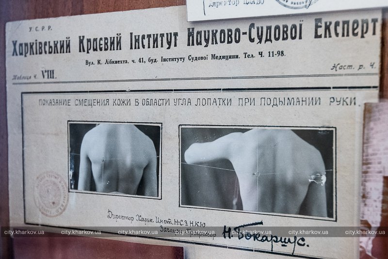 В институте воссоздали интерьер кабинета выдающегося харьковчанина, ученого - судебного медика и криминалиста. В музее собрано около 500 книг профессора, есть его семейный фотоальбом с личной подписью, письма, альбомы его детей. На рабочем столе лежат чертежи теплицы для выращивания лекарственных растений, которую хотел построить Николай Бокариус, лежит личная печать его отца, которой он всю жизнь заверял документы, а также стоит печатная машинка тех лет, микроскоп, телефон. За столом сидит сам профессор – его восковая фигура, которую создавали по сотне личных фотографий ученого, чтобы достоверно передать его внешность. На маленьком столике рядом стоят его шахматы и самоучитель, которые сохранил и передал музею сын Николая Бокариуса. Также в кабинете можно увидеть рабочее место, за которым студенты проводили лабораторные исследования, его создал сам профессор.