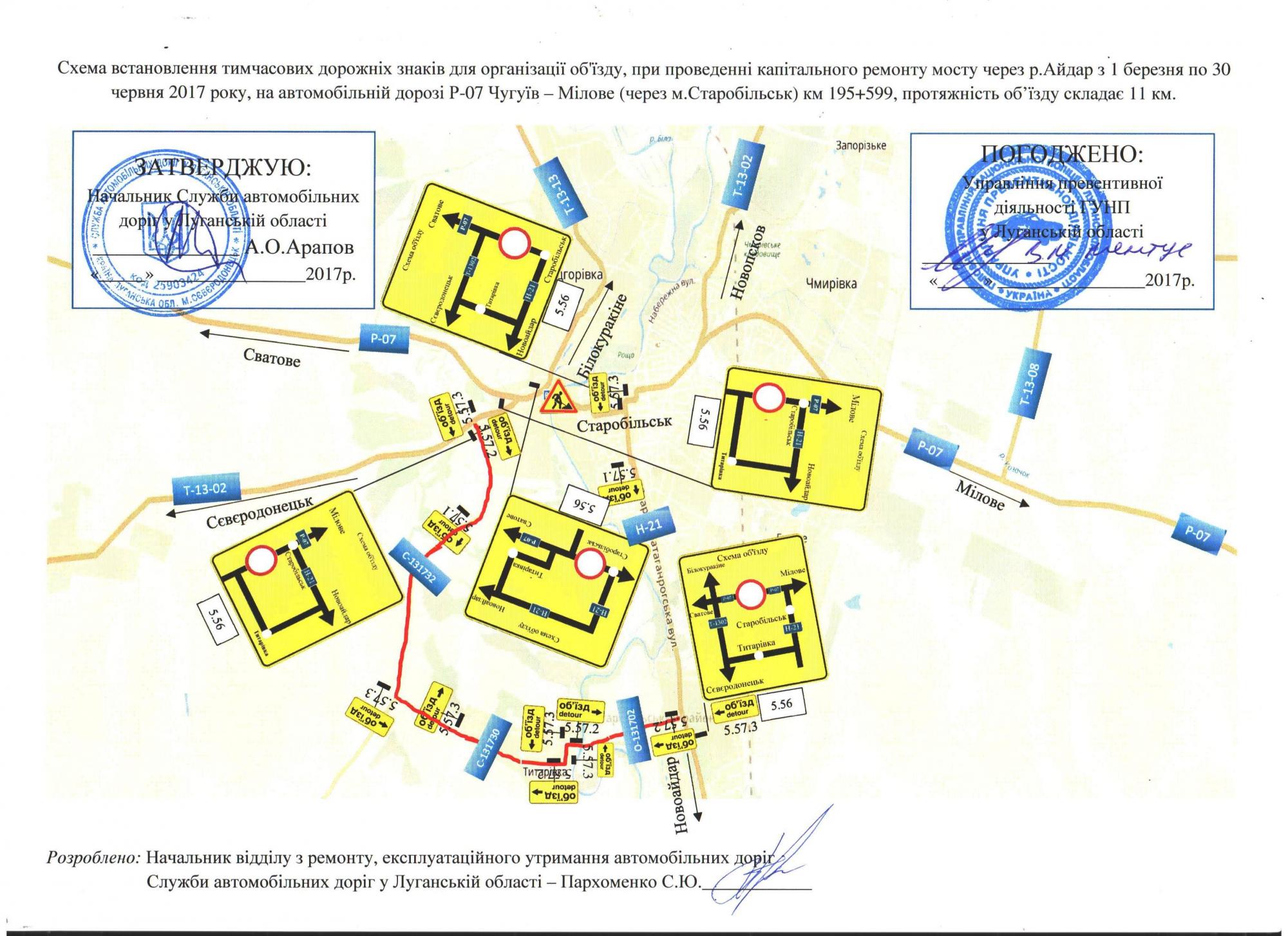 На период закрытия участка, объезд транспортных средств будет осуществляться по автомобильным дорогам С131730 (Пидгоривка- Каменка) -Титаривка, С131732 Пидгоривка- Каменка в с. Титаровка и О131702 Титаривка- (Старобельск-Луганск-Донецк) до автомобильной дороги Н-21 Старобельск-Луганск-Красный Луч-Макеевка-Донецк.