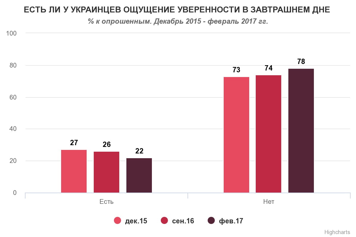 С декабря 2015 года ситуация с уверенностью украинцев в завтрашнем дне изменилась незначительно, но в направлении ухудшения – тогда уверенных в завтрашнем дне украинцев было 27%, а не уверенных – 73%.
