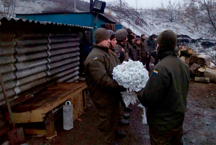 Недавно нацгвардейцы, которые выполняют служебно-боевые задачи в зоне проведения антитеррористической операции, получили очередную помощь от волонтерских организаций Харькова, Днепропетровской области и Ямполя Винницкой области. Они с первых дней вооруженного конфликта оказывают помощь не только людям в военной форме, но и гражданскому населению. Маскировочные сетки, сплетенные вручную женщинами и учениками школ - очень необходимые вещи для военных на Востоке.