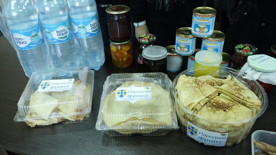 В рамках празднования Масленицы активисты Харьковского городского «Народного фронта» передали раненым бойцам, которые проходят лечение в военном госпитале, блины и сладости к ним (мед, варенье, сгущенное молоко).