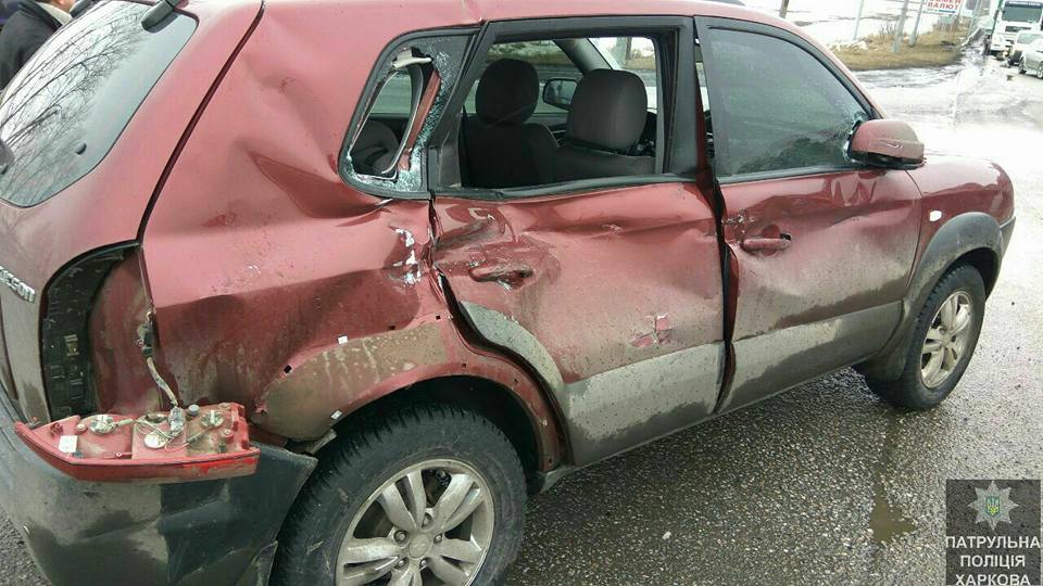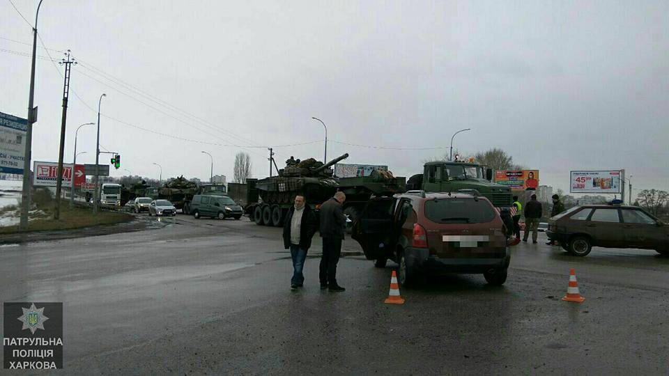 Утром 25 февраля на пересечении улицы Леся Сердюка и кольцевой дороги произошла авария с участием автомобиля Hyundai Tucson и двигавшейся военной техники. О ДТП сообщает патрульная полиция.