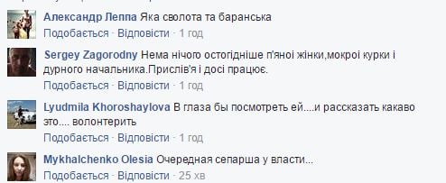 Керівництво Міністерства оборони України вважає неоціненним внесок кожного волонтера у військову міць і обороноздатність нашої держави. Саме тому в лавах Збройних Сил України не можуть служити або працювати особи, які зводять прикрі наклепи на волонтерів, зробивших великий внесок у безперебійне функціонування армії України. Така позиція керівництва Міністерства оборони України обумовлює вживання вимушених заходів, а саме звільнення зазначених осіб із займаних ними посад. Тому співробітниця Міністерства оборони України, яка у соціальній мережі звела наклеп на діяльність волонтерів у районі проведення АТО, звільнена за рішенням керівництва Міністерства оборони України.