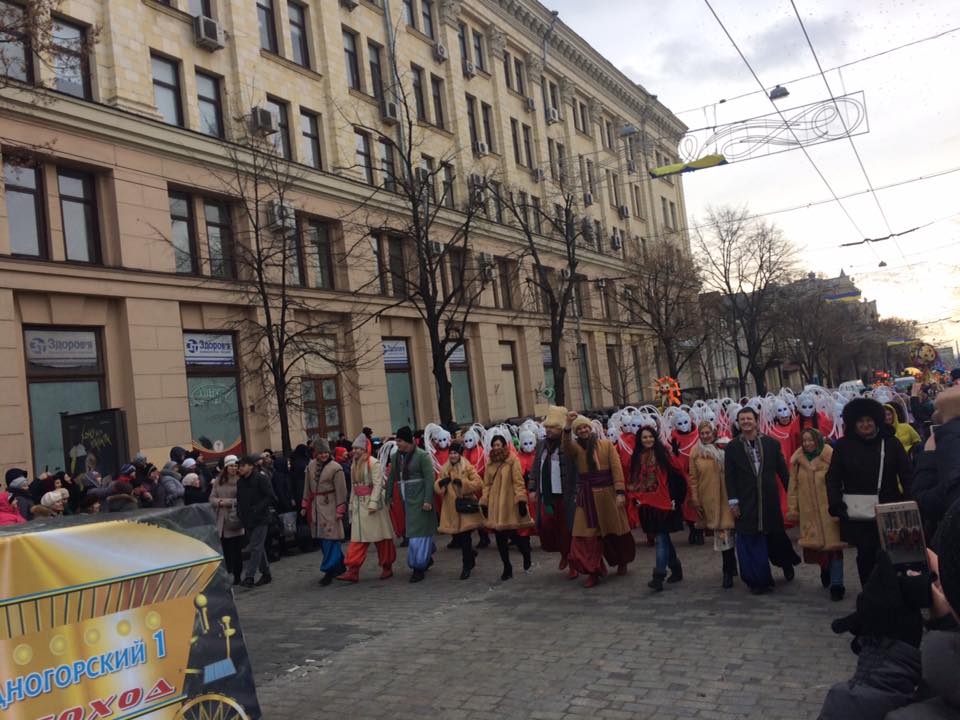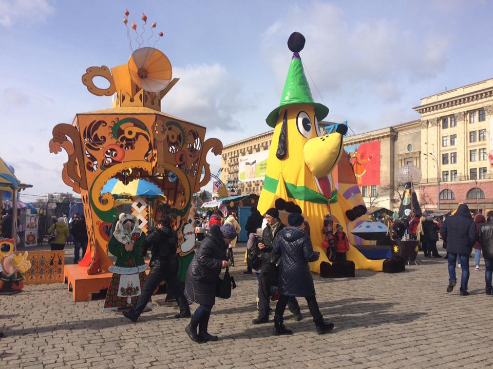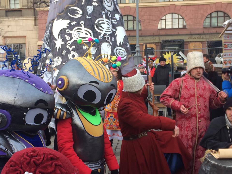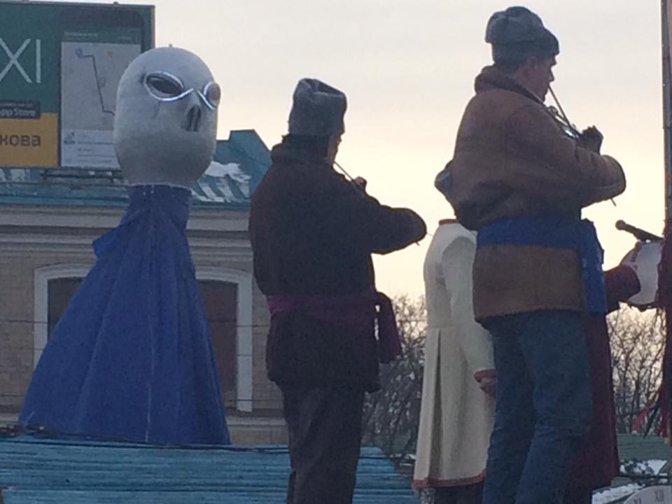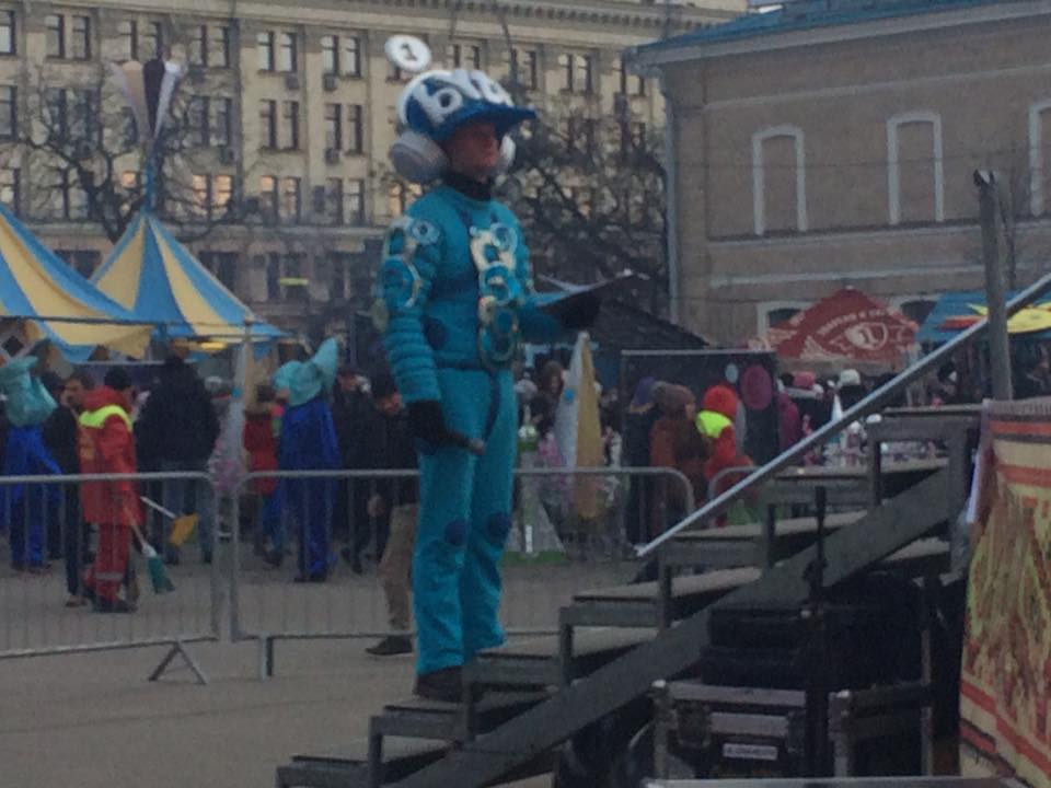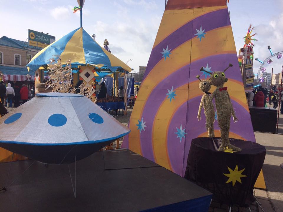 И вся площадь представляет собой дикий микс космоса, казаков, инопланетян, лопающих людей и танцев с бубнами. Ростовые куклы игриво подмигивают потасканными головами, в кабаке с потолка свисают блины, глинтвейн варят в казанах.