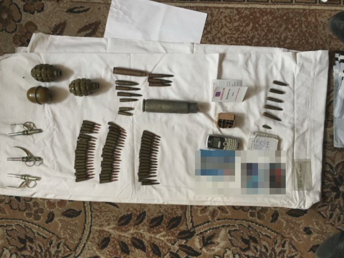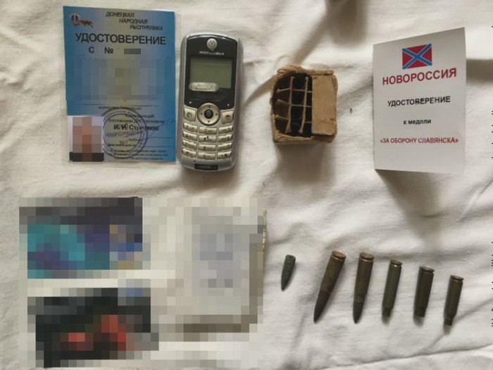 Під час обшуків за місцем мешкання бойовика правоохоронці вилучили дві гранти Ф-1, одну гранату РГД-5, понад 60 набоїв до стрілецької зброї, посвідчення бойовика т.зв. «ДНР», посвідчення про нагородження фейковою нагородою «за оборону Славянска», засоби зв’язку та банківські картки.
