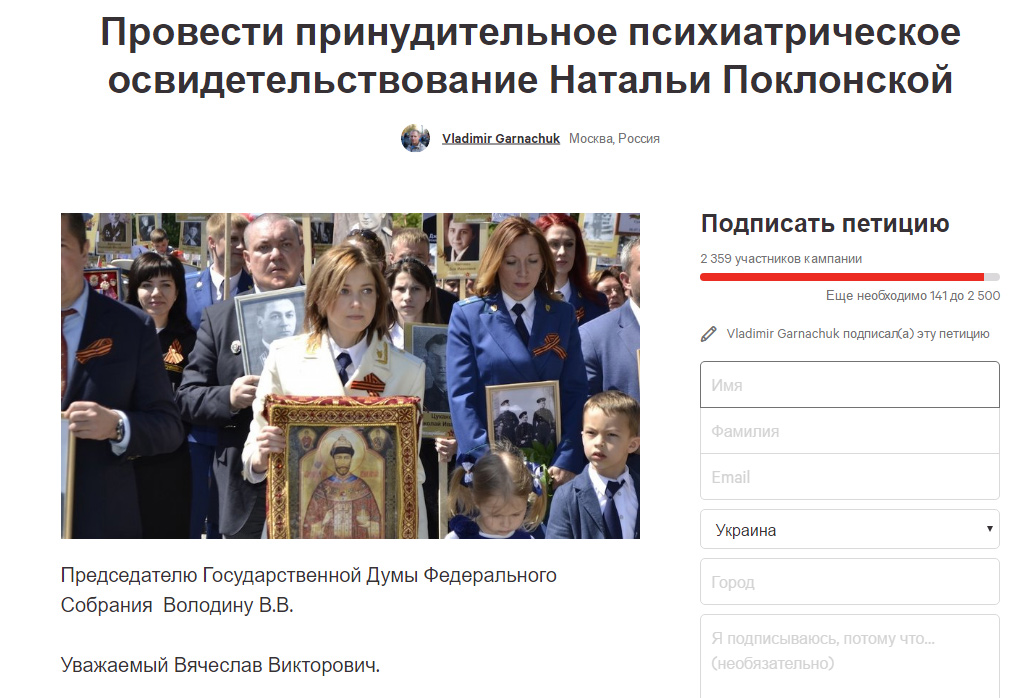В Интернете набирает популярность онлайн-петиция с просьбой направить на медицинскую психиатрическую экспертизу депутата Госдумы от Крыма Наталью Поклонскую.