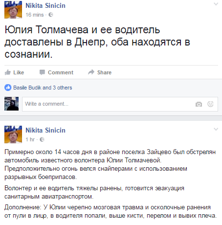 "Держите кулаки, молитесь, поддерживайте. У нас в команде есть раненые. Юлия Толмачева и Сергей Адомяк попали под снайперский огонь со стороны сепарского террикона", — сообщил он, добавив, что "состояние обоих не тяжёлое".