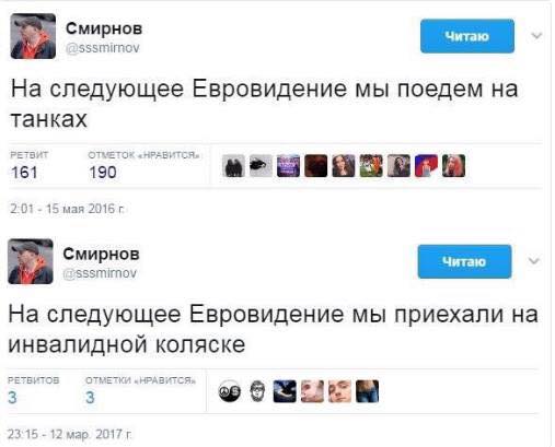 Евгений Шестаков: "Если решили сыграть на жалости и послать на Евровидение певицу с ограниченными возможностями, надо было брать не Юлию Самойлову, она симпатичная и, возможно, умеет петь. Надо послать настоящую певицу с ограниченными возможностями, у которой не тело, а голова сидит в инвалидном кресле - Ваенгу, например".