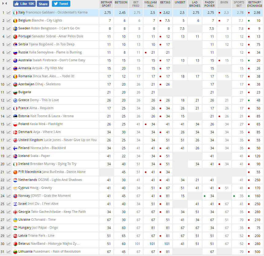 Победу отдают Италии, которую представит Франческо Габбани, второе место - Бельгии, третье - Швеции.