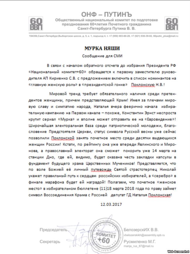 «Имея за плечами мировую славу и симпатию народа, Наталья вчера феерично начала избирательную кампанию на Первом канале – похоже, Константин Эрнст неспроста крутит сериал «Мурка» и вполне может отправить ее на «Евровидение»! Широчайшая электоральная база среди патриотической молодежи, благословение Предстоятеля Церкви, статус символа Русской весны уже сейчас позволили Поклонской занять почетное место среди десятки выдающихся женщин России!» – говорится в документе.