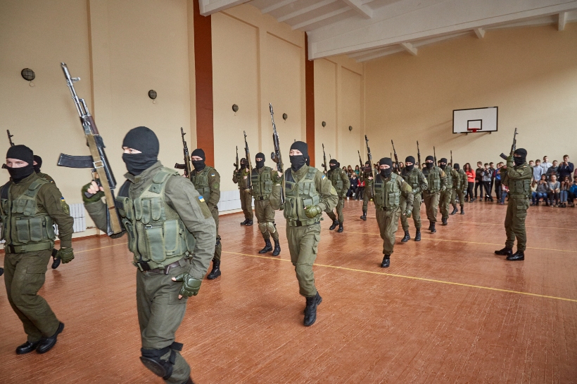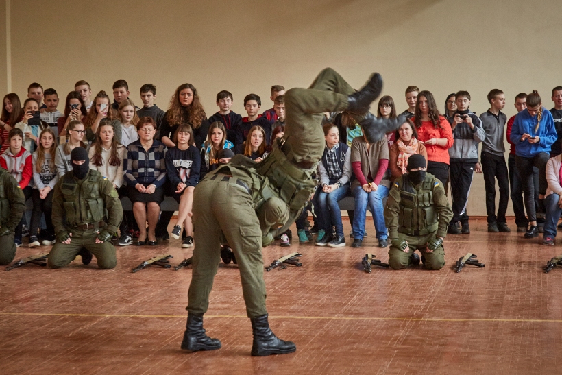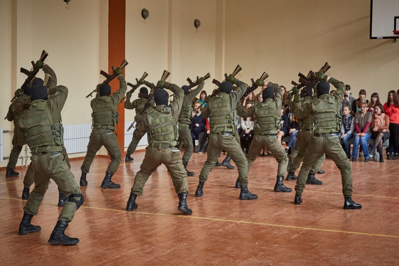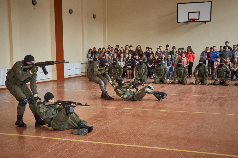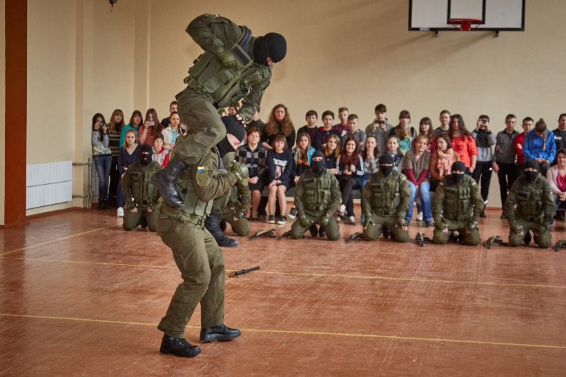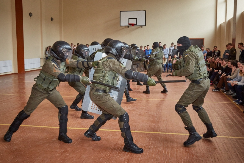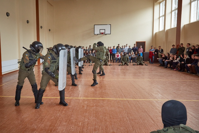 Курсанты взвода специального назначения командно-штабного факультета Национальной академии Национальной гвардии Украины показали высокий уровень подготовки во время показательного выступления перед харьковскими школьниками. Мероприятие было организовано и проведено в рамках агитационной работы в общеобразовательных школах Харькова.