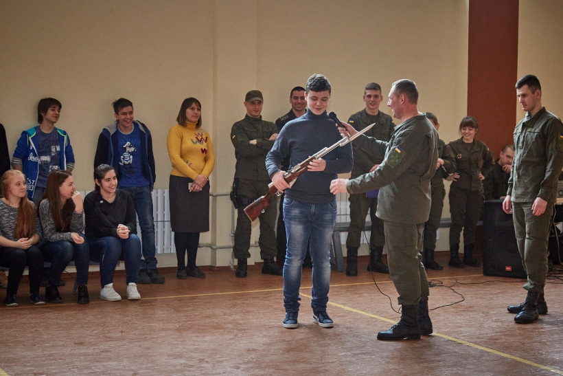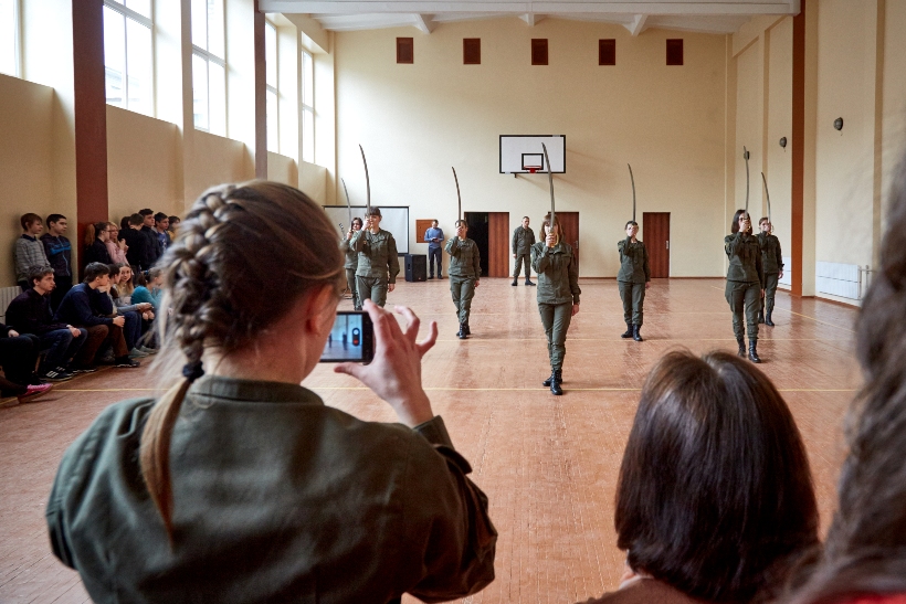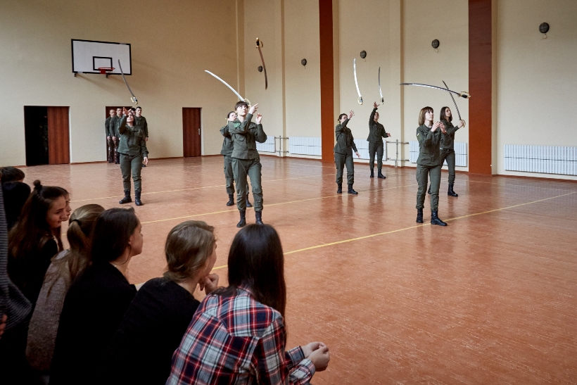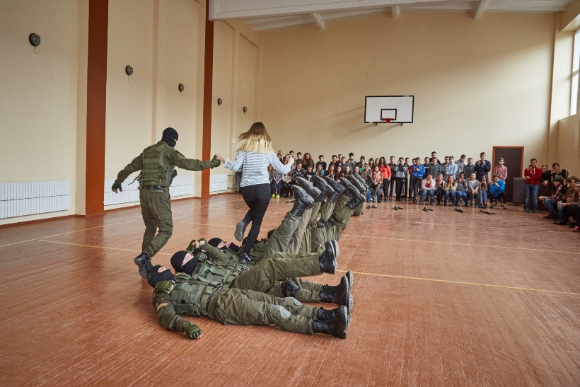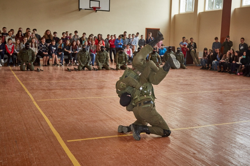 Будущие офицеры, после четырехлетнего обучения станут бойцами элитных подразделений специального назначения Нацгвардии. Сегодня они показали школьникам приемы рукопашного боя без оружия и с оружием, рукопашный бой в парах, приемы самострахования и защиты при нападении противника с холодным или огнестрельным оружием.