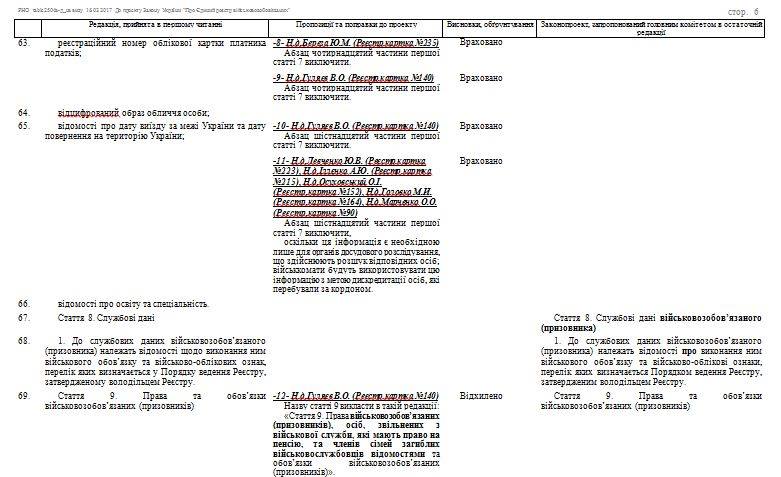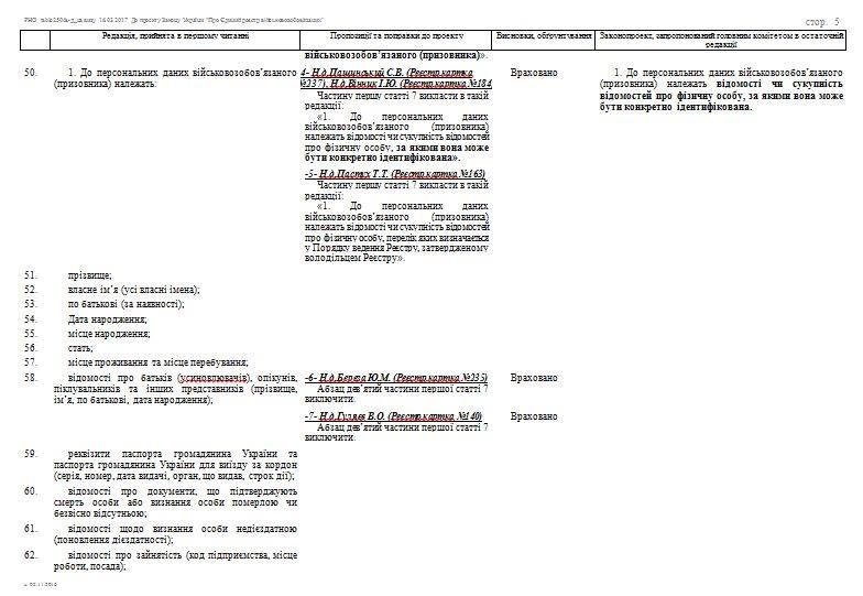 Как отметили нардепы в сравнительной таблице, "оскільки ця інформація є необхідною лише для органів досудового розслідування, що здійснюють розшук відповідних осіб; військкомати будуть використовувати цю інформацію з метою дискредитації осіб, які перебували за кордоном."