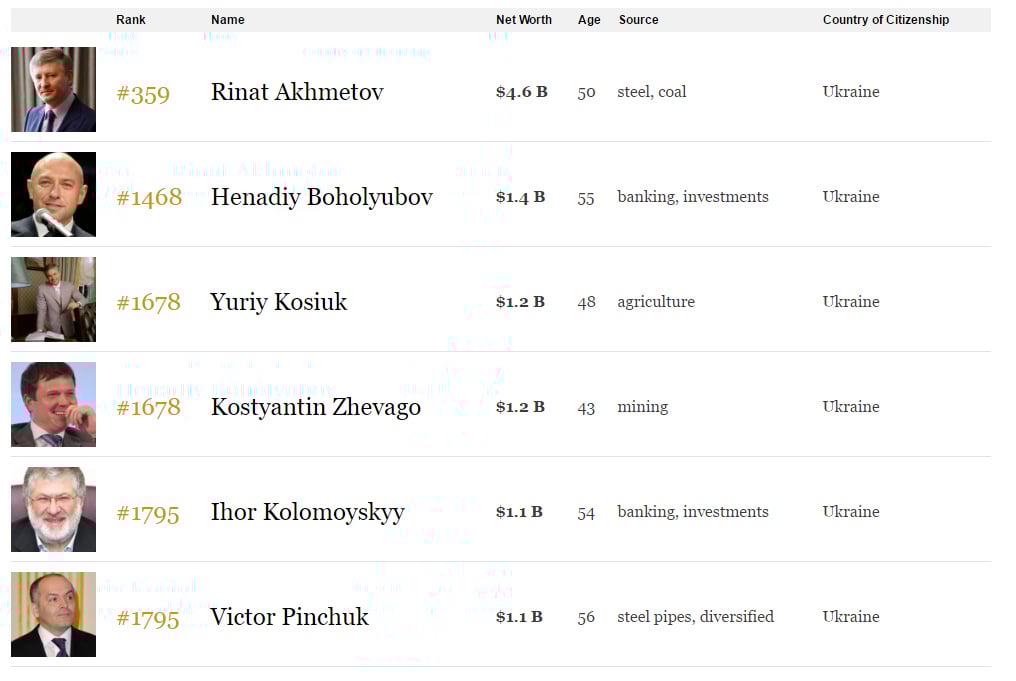 В списке самых богатых людей мира — 6 украинцев. Лидером по объему активов среди украинских предпринимателей назван Ринат Ахметов с 4,6 миллиардами долларов, он расположился на 359-й строчке мирового рейтинга.