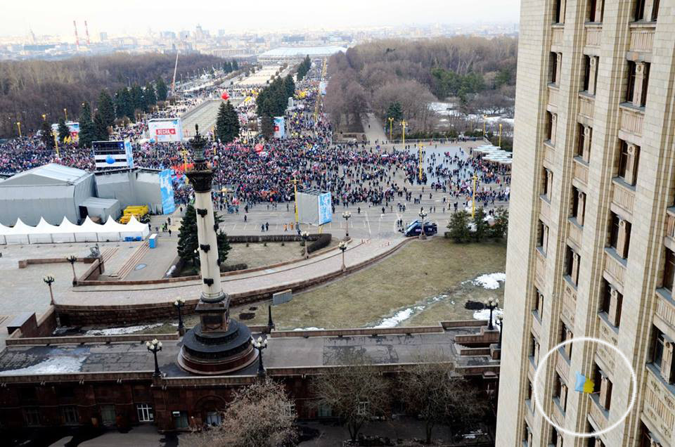 Аспирант исторического факультета сделал флаг из двух кусков ткани и начал размахивать им из окна своей комнаты во время празднование "присоединения" Крыма 18 марта.