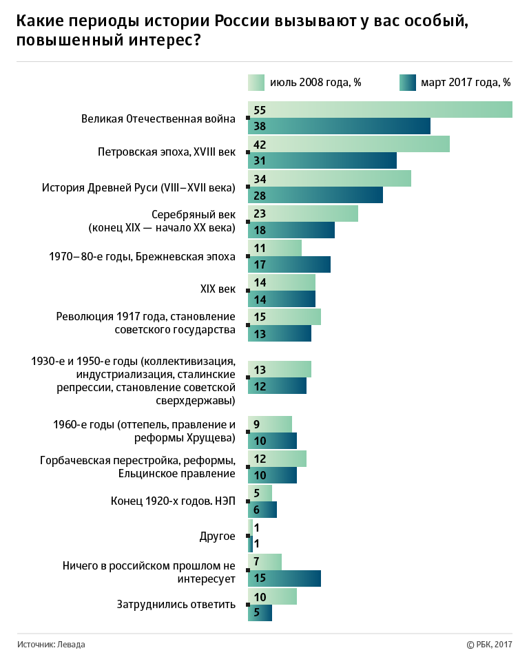 Если в июле 2008 года к этому периоду внимание проявляли 55% респондентов, то в марте 2017 года — всего 38%. В то же время растет внимание граждан к истории брежневской эпохи с 11 до 17%.
