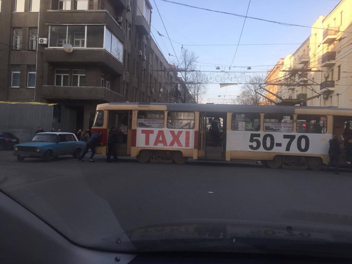 На перекрестке улицы Сумской и Маяковского в центре Харькова остановился трамвай. Чтобы разблокировать движение, люди выталкивают его с центральной улицы города.